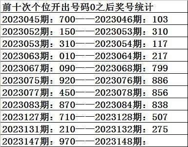 四、个位分析:上期开出号码0,前10次号码0出现之后下期同位号码为:3077966875,其中号码大小比为8:2,小号走势较冷;奇偶比为6:4,基本相等;012路比为5:3:2,0路号码表现相对活跃。本期参考号码:3。