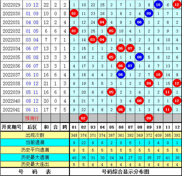 后区上期两码开出06和11,其号码遗漏值为3期+1期,本期后区重防冷码解冻,四码参考02、04、09、12,两码关注02和09。