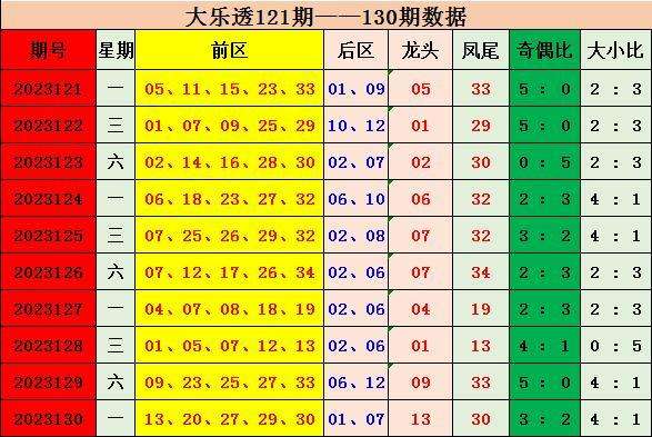大乐透2023130期开奖:前区13 20 27 29 30,后区01 07。龙头:13,凤尾30,奇偶比为3:2,大小比4:1。