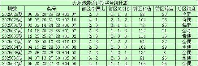 大乐透第2025037期开奖,前区:05、20、23、27、31;后区:04、06。其中前区和值为106,跨度为26,012路比为1:1:3,奇偶比为4:1,后区开出全偶、1路+0路组合。