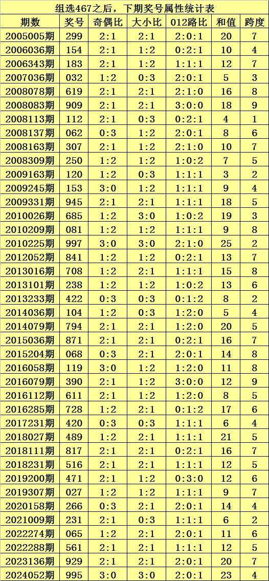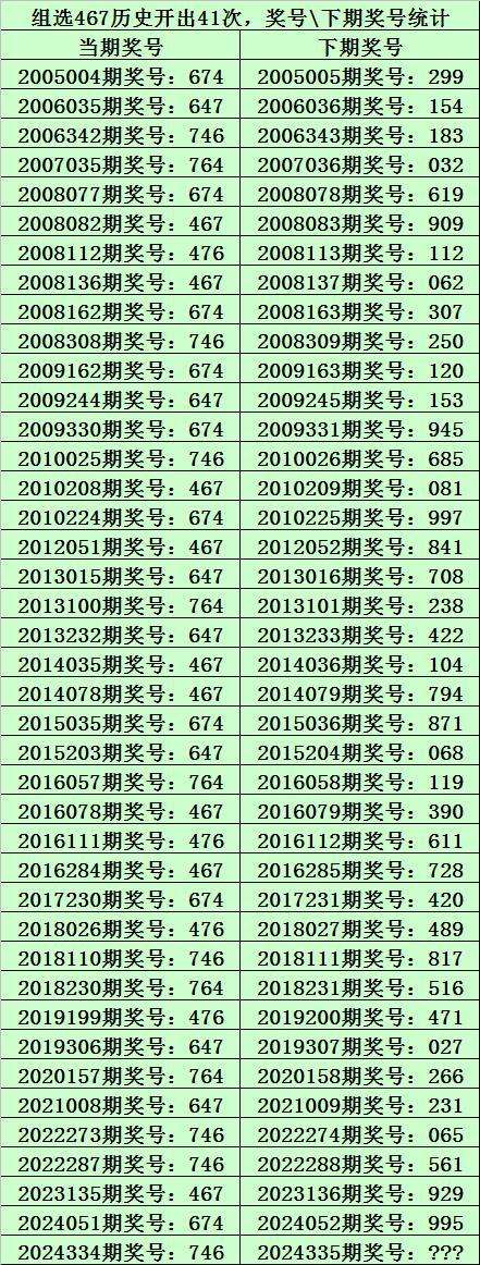 二、组选467分析:排列三历史上已开出41次组选号码467了,其奖号和下期开出奖号统计如下: