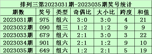 上期回顾:排列三第2023035期开奖号码为649。奖号类型为组六,奇偶比为1:2,大小比为2:1,跨度为5,和值为19。