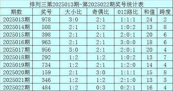 上期回顾:排列三第2025022期奖号为484,奖号012路比为0:2:1,奇偶比为0:3,大小比为1:2,和值为16,跨度为4。