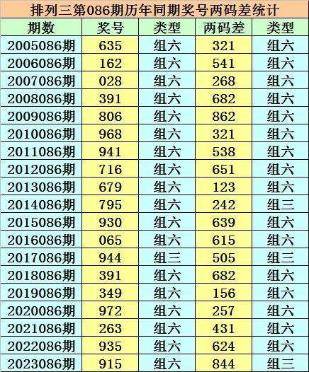 在排列三第086期历史同期开奖中,各号码两码差分别为:123、145、268、268、268、123、358、156、123、224、369、156、055、268、156、257、134、246、448;