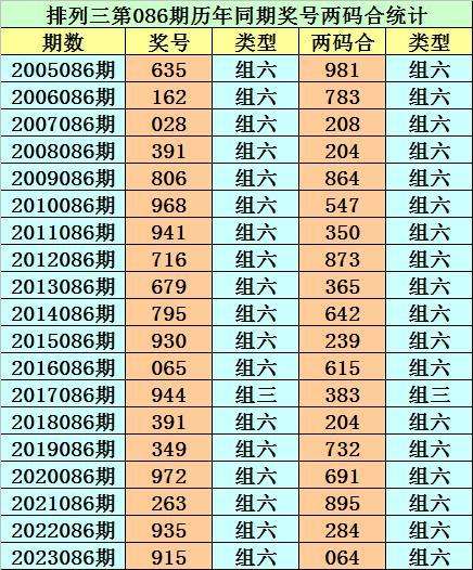 排列三从2004年开奖至今已开出6857期奖号了,其中第086期历史同期奖号出现19次,历年第086期分别开出号码:635、162、028、391、806、968、941、716、679、795、930、065、944、391、349、972、263、935、915。