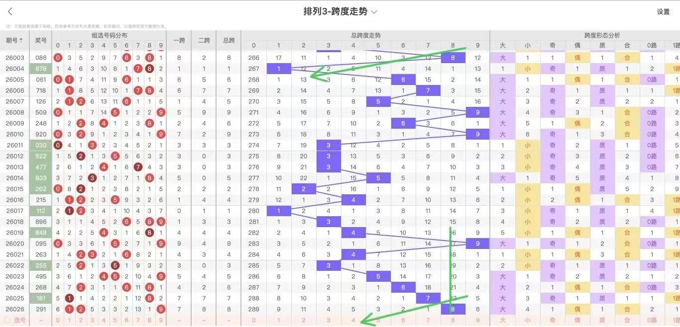 10期内跨度走势为:1-3-4-9-4-3-5-6-7-8,10期内大小跨比为5:5,奇偶跨比6:4,百期内跨度8共开出7次,下期数据:5 6 2 5 3 1 近期度较热,考虑跨度8开出后容易出大跨度,近期大小规律下大:奇:质,所以接下来继续大跨,偶跨度表现!