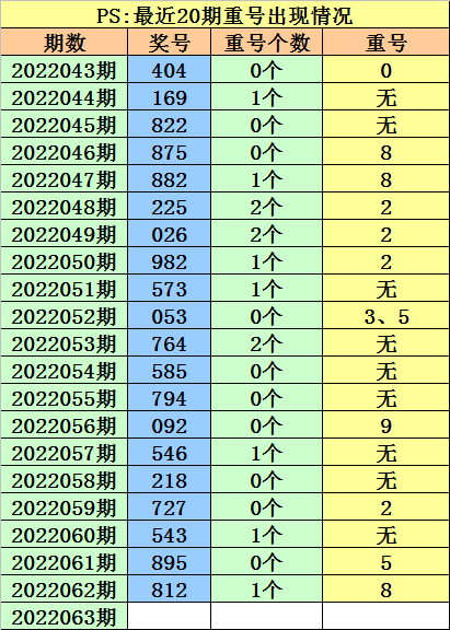 最近100期开奖中,含有重号的奖号有51期,最近20期含有重号的奖号有11期,最近10期含有重号的奖号有4期。本期注意重号落号。