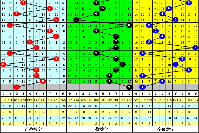 百位分析:最近50期表现较热的号码有:2、4、6、7出现6次;表现较冷的号码有:0出现3次,1、3出现4次。出号奇偶比为24:26,012路比为18:16:16。本期该位绝杀两码5、9,参考号码2、3、7,精选一码2。