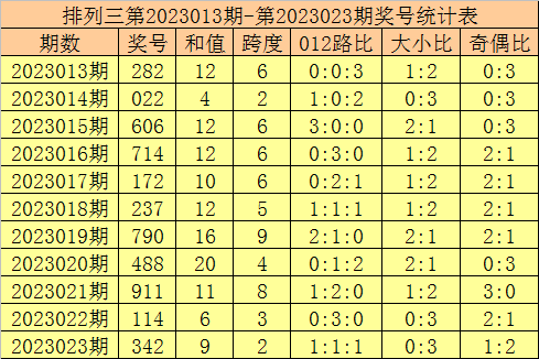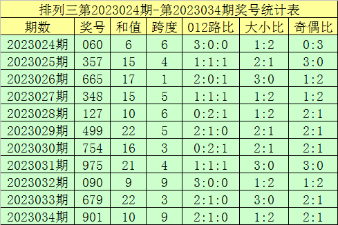 开奖回顾:排列三第2023034期奖号开出:901,组选类型:组六,大小比为1:2,奇偶比为2:1,和值为10,跨度为9。