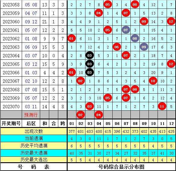 后区分析:后区上期开出奖号03 11,在最近15期开奖中奖,后区各号码频次分别为:号码07开出5次,号码03、05开出4次,号码01、08开出3次,号码02、09、11、12开出2次,号码04、06、10开出1次。本期预计后区在02、04、05、06、09、10之中出现,精选两码02+04。