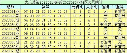 开奖回顾:体彩大乐透第23070期奖号开出:10 26 29 32 33+03 11,前区奖号奇偶比为2:3,012路比为1:1:3,大小比为4:1,包含连码组合:32 33,包含1个重号:32。