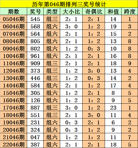 历年第046期排列三奖号:545 - 568 - 564 - 805 - 802 - 961 - 909 - 373 - 446 - 584 - 305 - 126 - 887 - 551 - 231 - 324 - 047 - 387。