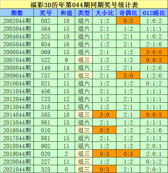 奇偶比推荐:在第044期历史同期开奖中,奇偶比3:0开出1次,奇偶比0:3开出2次,奇偶比2:1开出7次,奇偶比1:2开出10次,奇偶奖号总个数比27:33,奇数号码相对劣势,今年同期适当关注奇数号码回补,参考奇偶比2:1。
