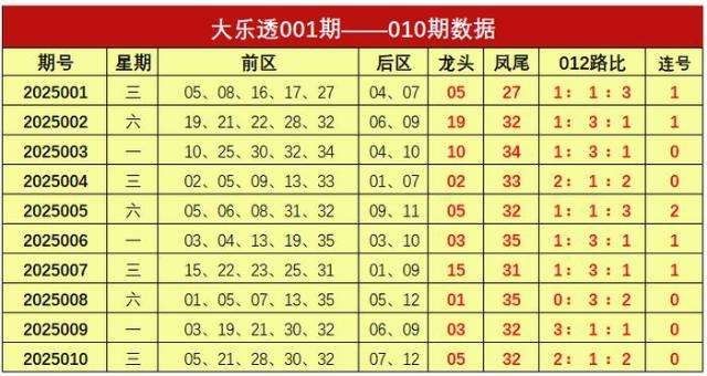 大乐透第2025010期出奖号统计:前区05、21、28、30、32,后区07、12。龙头05,凤尾32,012路比为2:1:2,未开出连号。