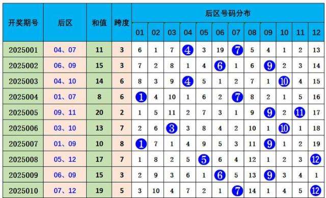 上期后区开出奖号07、12,奇偶比1:1,近10期奇偶比12:8,本期推荐奇偶比1:1,参考后区号码11、12。