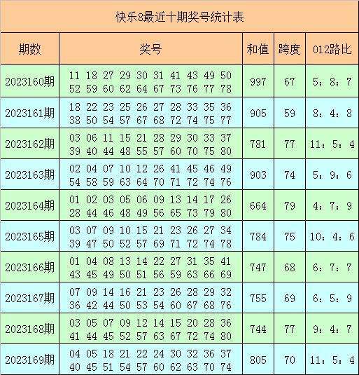 快乐8第2023169期奖号为:04 05 18 21 22 24 30 32 36 37 40 45 51 54 57 60 62 63 70 74,其中奖号012路比为11:5:4,和值为805,跨度为70。