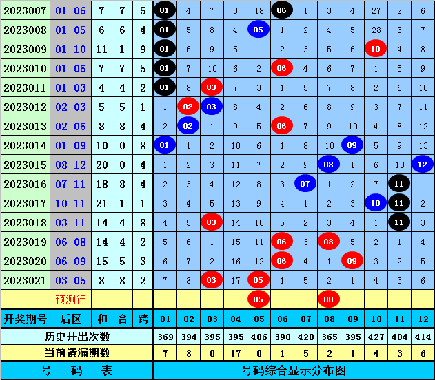 前区冷热分析:上期前区开出1个冷码奖号:18,奖号冷热比为1:4,本期参考冷热比2:3,关注冷码13、20。