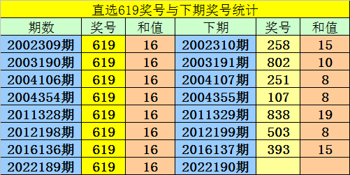 第2022189期3D奖号为:619,历史上该号码直选开出8次,下期号码分别为:258、802、251、107、838、503、393。