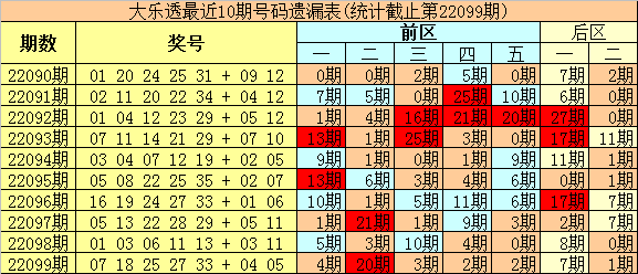开奖回顾:大乐透第22099期奖号为:07 18 25 27 33 + 04 05,前区号码大小比为4:1,和值为110,跨度为26,奇偶比为4:1。后区和值为9。
