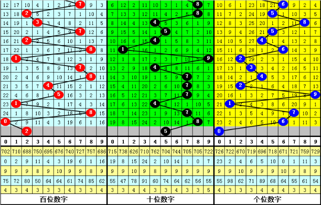 跨度分析:最近周二跨度出现范围在2-7区间,跨度比较集中,上周二跨度为4,跨度上升了2个点位,本期看好跨度上升,参考跨度5。