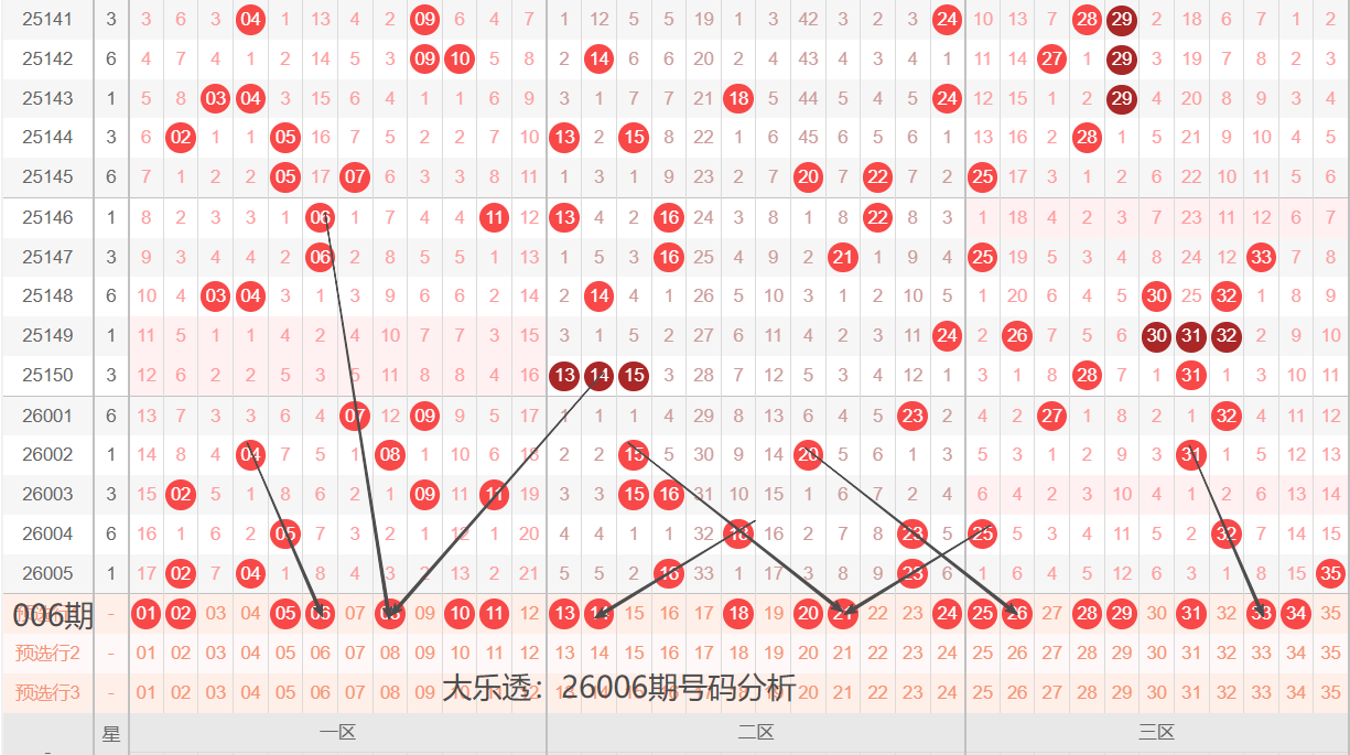 通过上期号码的简单分析,我们看下26006期红色号码球的总体走势,如下图: