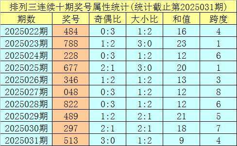 上期回顾:排列三第2025031期奖号:513。类型:组六,奇偶形态:奇奇奇,大小形态:大小小,和值:9,跨度:4。