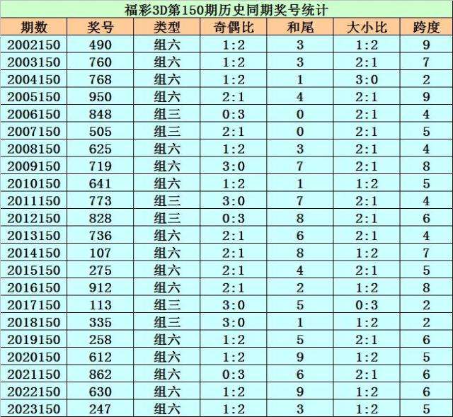 福彩3D历年第150期同期奖号为:490 760 768 950 848 505 625 719 641 773 828 736 107 275 912 113 335 258 612 862 630 247。