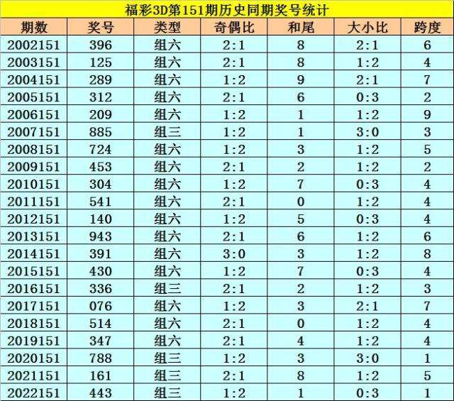 福彩3D历年第151期同期奖号为:396 125 289 312 209 885 724 453 304 541 140 943 391 430 336 076 514 347 788 161 443。