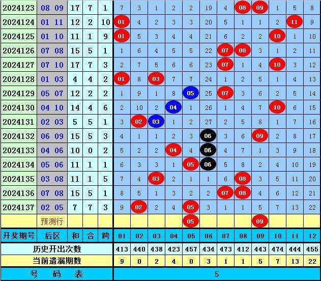 后区分析(定义:01-04为一区,05-08为二区,09-12为三区):上期后区开出奖号02和05,分别出现在第一区和第二区和区,最近10期后区三个区间落号个数比为8:10:2,本期后区注意第二区和第三区号码出现,关注两码05、09。