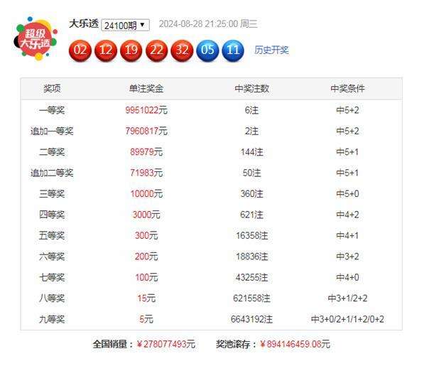 大乐透第2024100期开出奖号:02 12 19 22 32 + 05 11。其中前区三区比为2:2:1,和值为87,奇偶比为1:4,跨度为30,后区分布在第二区和三区中。