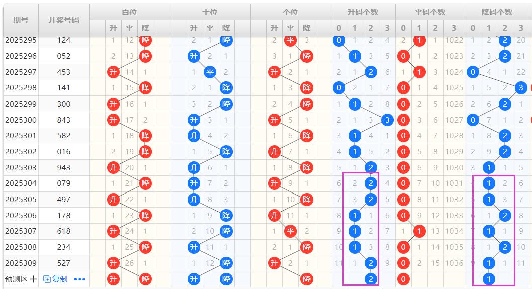 【降码个数】:近十期升码个数走势为:2-0-3-2-0-2-2-1-1-2-1-2-1,在近期降码个数以1个为主,上期开出3个,本期有望回落,看好0-1个降码的出现。