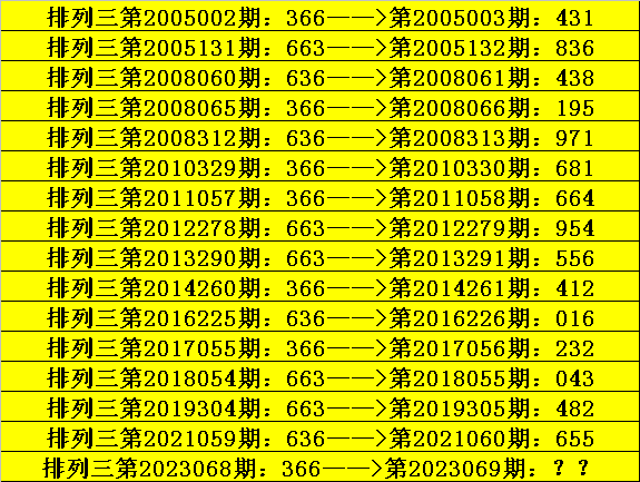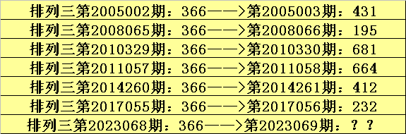 第2023068期排列三奖号为366,历史上该号码直选出现7次,下期奖号分别为:431、195、681、664、412、232。