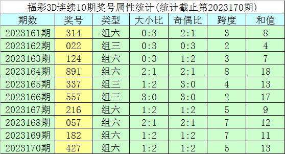 开奖回顾:福彩3D第2023170期奖号为427。奖号形态为组六,大小形态为小小大,奇偶形态为偶偶奇,和值为13,跨度为5。