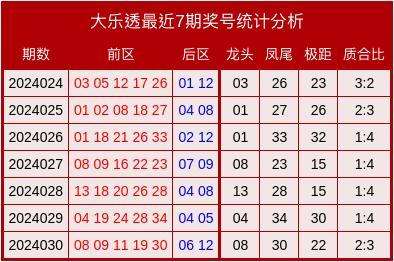 上期大乐透的开奖号码中,首尾组合为08+30,跨度为22,质合比为2:3。