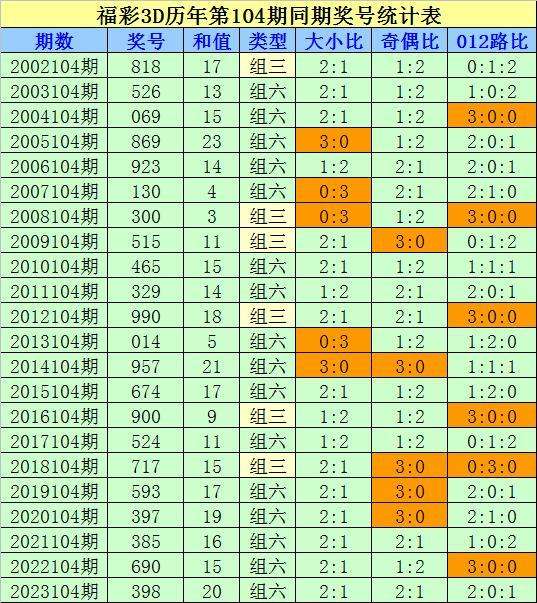 组选类型判断:在第104期历史同期开奖中,组六开出16次,组三开出6次,今年同期看好开出组六号码。
