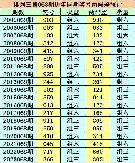 在排列三第068期历史同期开奖中,各号码两码差分别为:369、033、123、123、134、224、055、347、022、112、044、123、156、088、055、134、145、066、033;