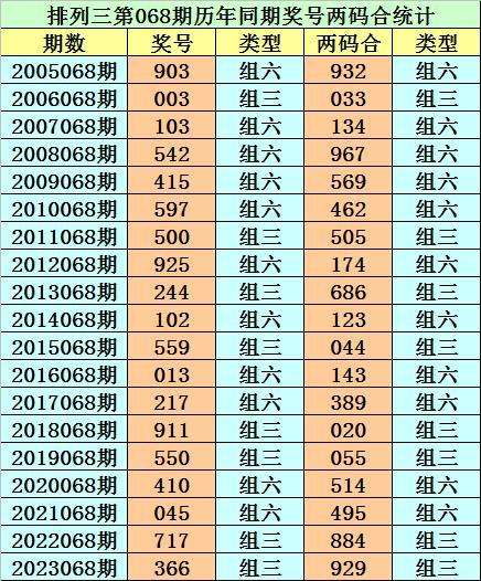 排列三从2004年开奖至今已开出6839期奖号了,其中第068期历史同期奖号出现19次,历年第068期分别开出号码:903、003、103、542、415、597、500、925、244、102、559、013、217、911、550、410、045、717、366。