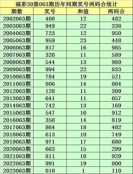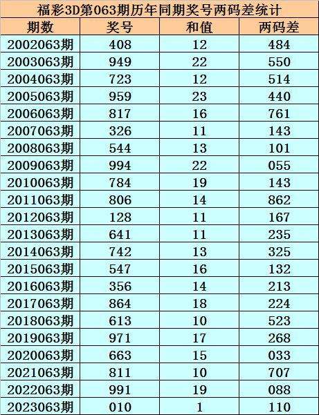 福彩3D第063期,历史上期开出22次奖号,其奖号分别为:408、949、723、959、817、326、544、994、784、806、128、641、742、547、356、864、613、971、663、811、991、010,奖号两码合差分别开出:
