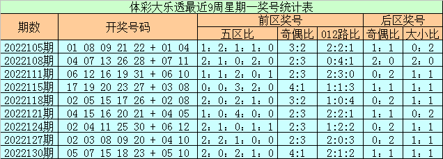 上期回顾:体彩大乐透上周星期一(第2022130期)奖号为05 07 15 18 23 + 05 10,前区奖号五区比为2:0:2:1:0,奇偶比为4:1,012路比为2:1:2,后区奖号奇偶比为1:1,大小比为1:1。