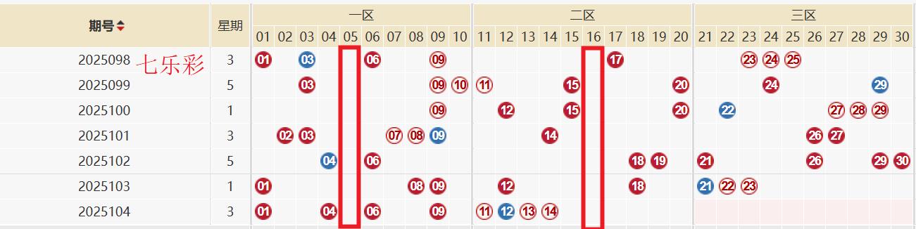 近七期开奖中一区出号数量为3+3+1+4+1+3+4=19枚,整体占比为38.8%;二区出号数量为1+3+3+1+2+2+3=15枚,整体占比为30.6%;三区出号数量为3+1+3+2+4+2+0=15枚,整体占比为30.6%。一区整体占比略高于均值,周期内呈现上升趋势,鉴于整体波动,本期慎防。二区占比低于均值,呈现上升趋势,本期重点关注。三区占比低于均值,呈现下降趋势,上期断区,周期内波动较大,本期慎防。基于动态平衡干预以及波动趋势衡量,本期七乐彩开奖三区比倾向于3:3:1。重点关注周期遗漏的5,16。