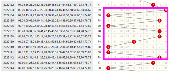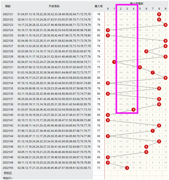 比如上图里,从133期到142期最大号码尾数都是0489,这些号码都是合数、偶数,因此很容易就能判断最大号码尾数应该要开出质数、单数了,因此143期就会去判断1、3、5、7尾数,143期最大号码是77,尾数为7与我们分析也是一致的。
