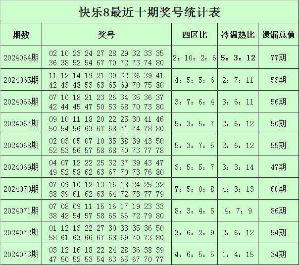 福彩快乐8第2024073期开奖回顾:03 12 16 18 22 24 28 36 38 39 47 50 52 53 54 63 65 67 70 77,其中奖号四区比为4:6:5:5,冷温热码比为1:4:15,遗漏总值为34。