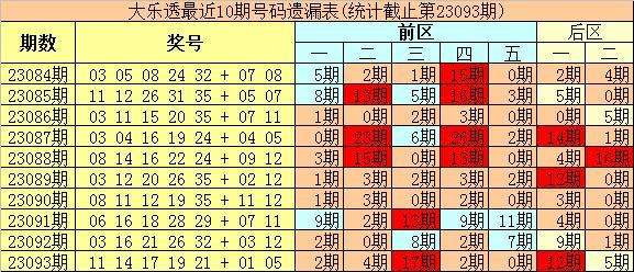 开奖回顾:大乐透第23093期奖号为:11 14 17 19 21 + 01 05,前区号码大小比为2:3,和值为82,跨度为10,奇偶比为4:1。后区和值为6。