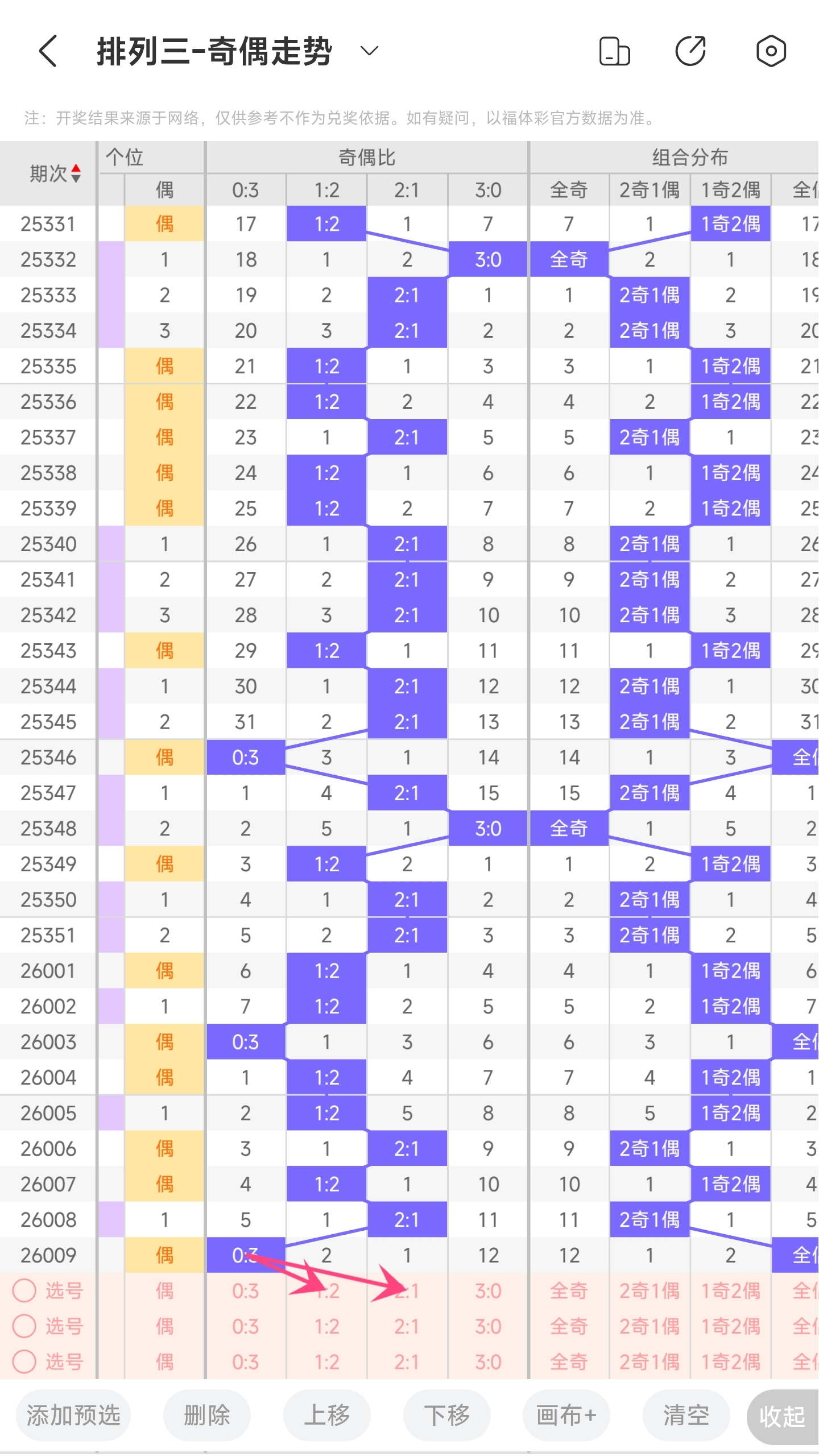 上期开出了0:2的奇偶比。往前一期是2:1奇偶比。通过分析奇偶走势图,近30期内开出1:2奇偶比的次数是12次,开出2:1奇偶比的次数是13次,3:0是2次,0:3是3次。和前一期相比,0:3次数变多,2:1次数变少。通过走势图分析,上期开0:3奇偶比,一般不会连续开出,本期比较看好1:2奇偶比。所以推测本期可能开1:2奇偶比,其次是2:1奇偶比,最后是3:0或者0:3奇偶比。