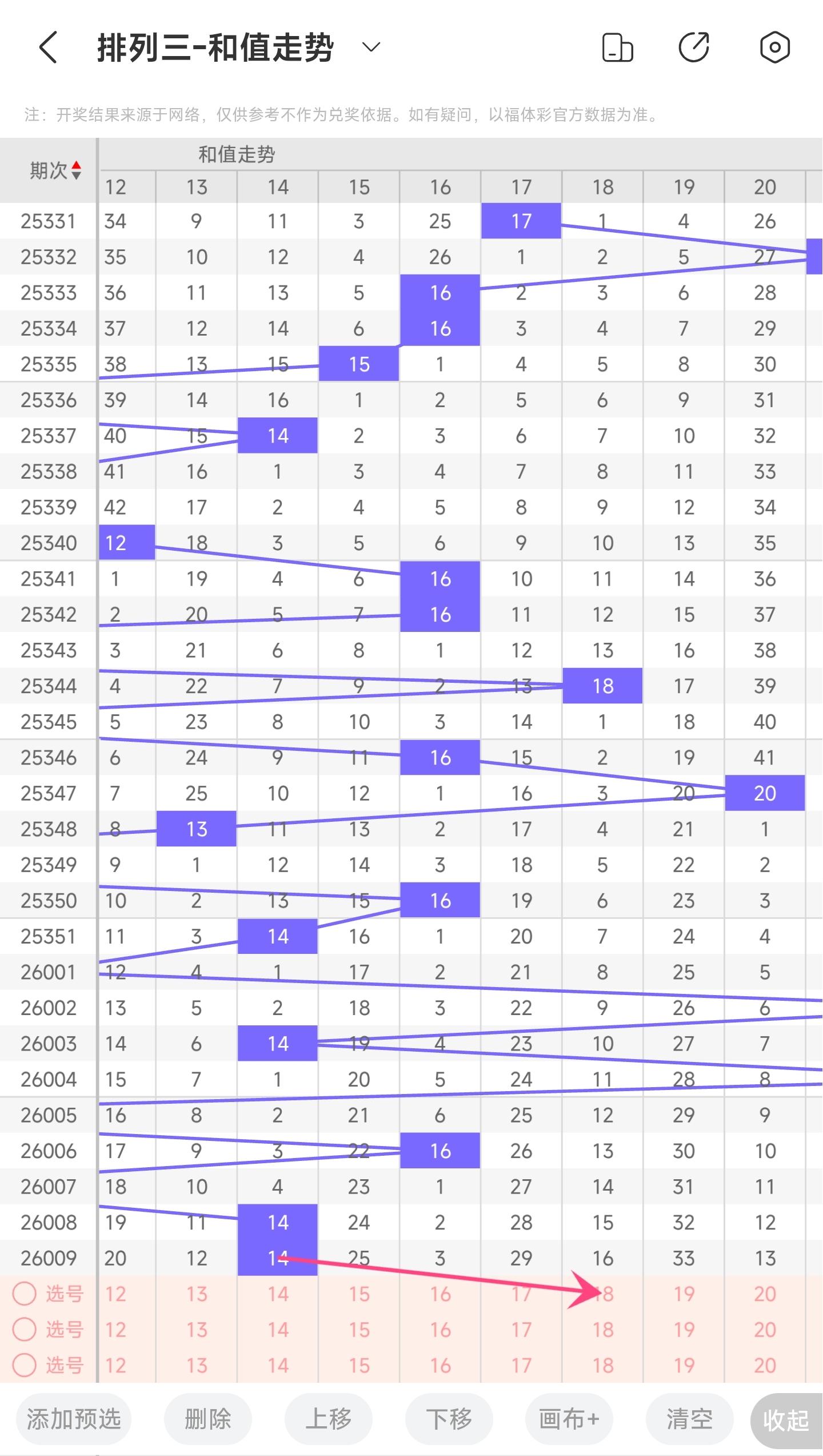 上期和值为14,往前一期和值为14,趋势没有移动,偏移量为0。通过走势图分析,14和值是近30期内开出中间的和值,下降空间和上升空间差不多。本期看好和值变小,因此推测本期趋势是往左的,和值会变小,小概率往右,和值变大。