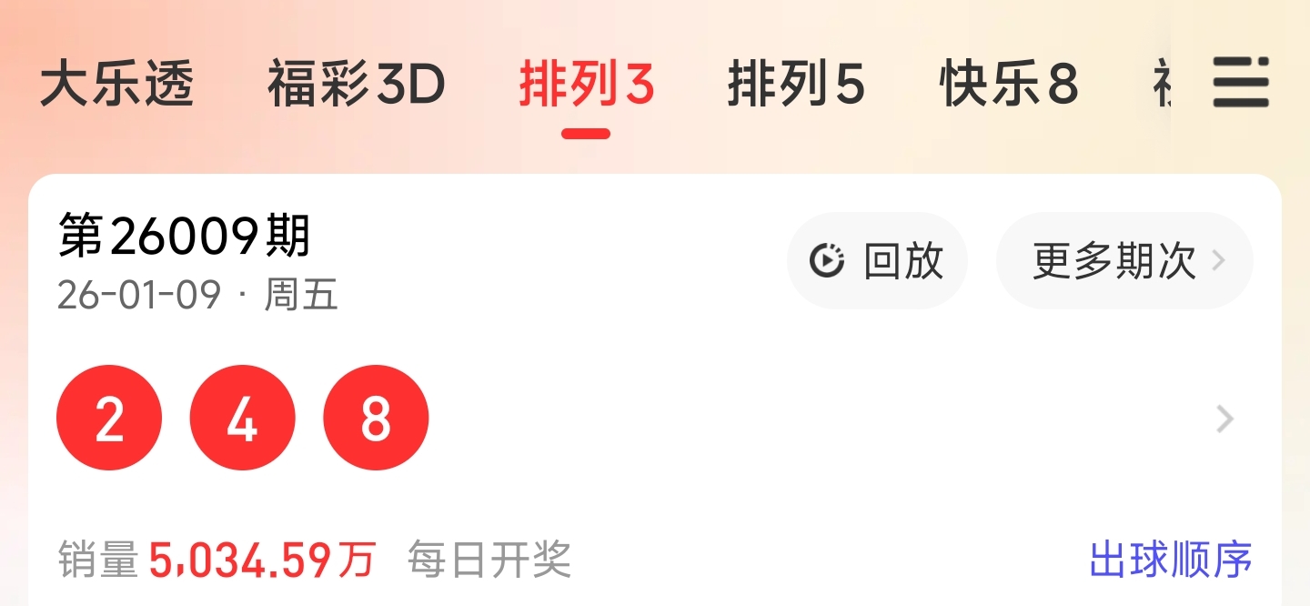 上期排列3开出248,和尾为4,跨度为6,奇偶比为0:3,大小比为1:2,012路个数对比为0:1:2。