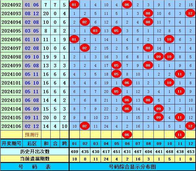 后区分析:上期后区开出一大一小组合:02+12,最近10期后区奖号大小比为12:8,本期防一大一小组合再出,参考两码06、11。