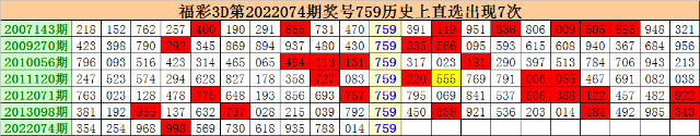 直选号码759历史上开出了7次,其下期分别开出奖号:391、335、317、220、795、450。