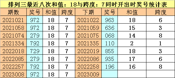 开奖回顾:体彩排列三第2023008期奖号为:972。和值为:18,跨度为:7。
