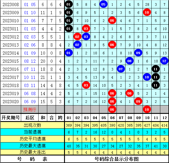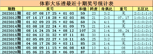 上期开奖:大乐透第2023020期奖号为:05 06 23 25 28 + 06 09,前区号码和值为87,跨度为23,奇偶比为3:2,重号:05,五区比为2:0:0:3:0。